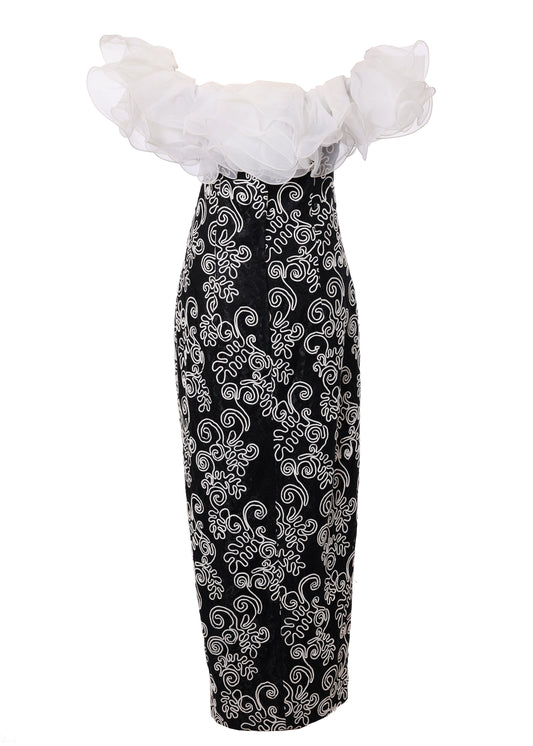 1980's Tadashi for Lillie Rubin Origami Ruffled Black & White Party Dress