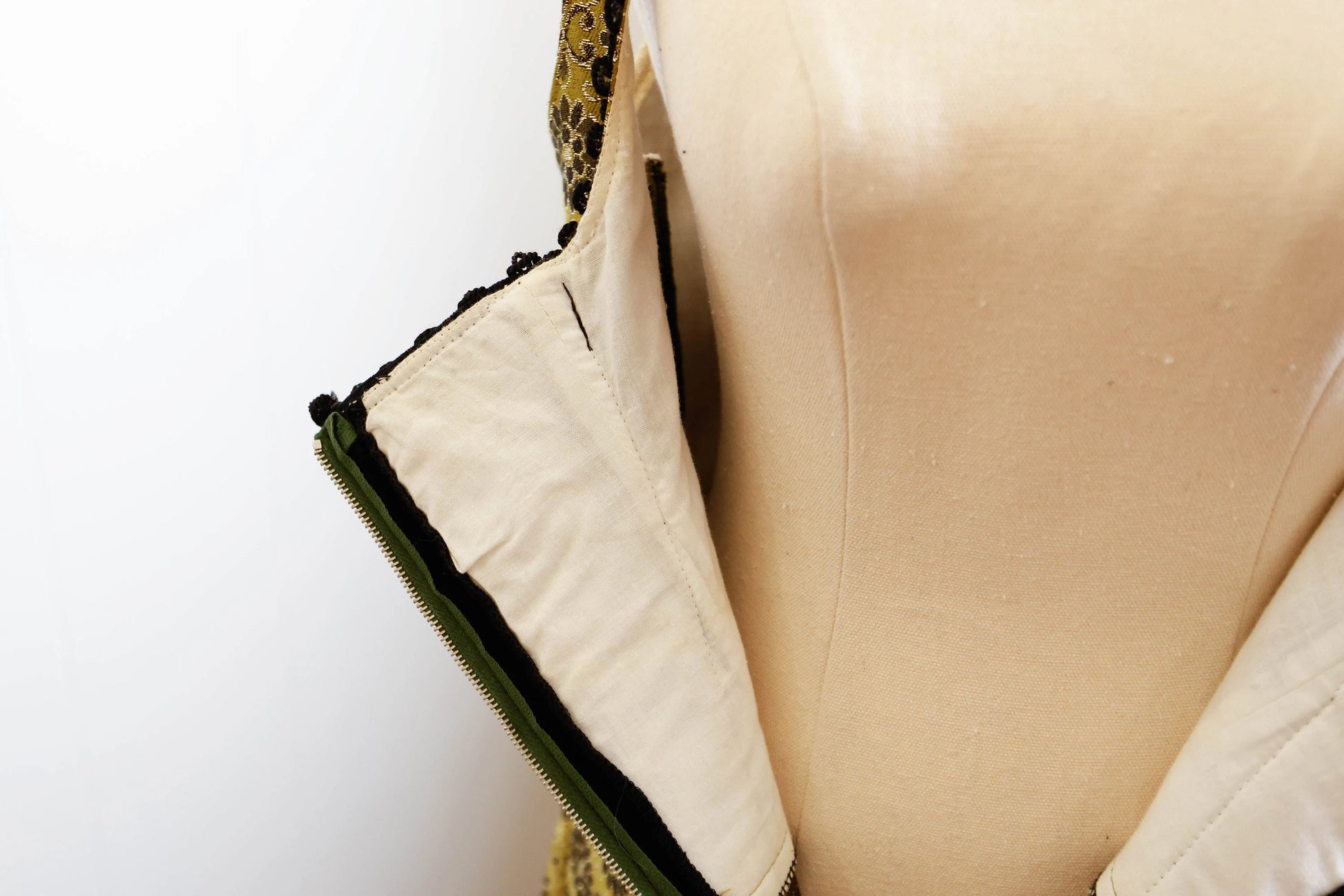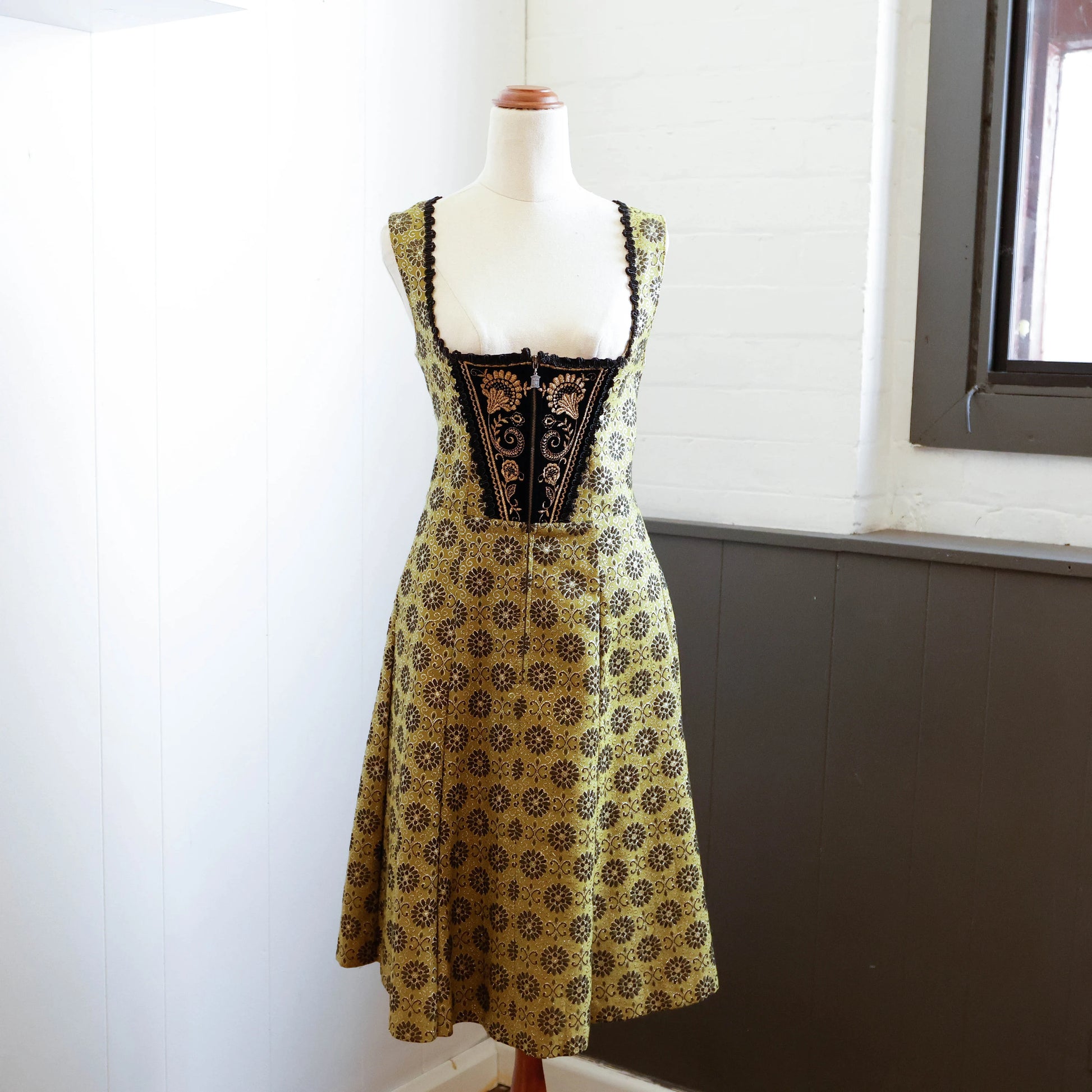 Vintage traditional German Dirndl in a sumptuous olive green, black and gold brocade.