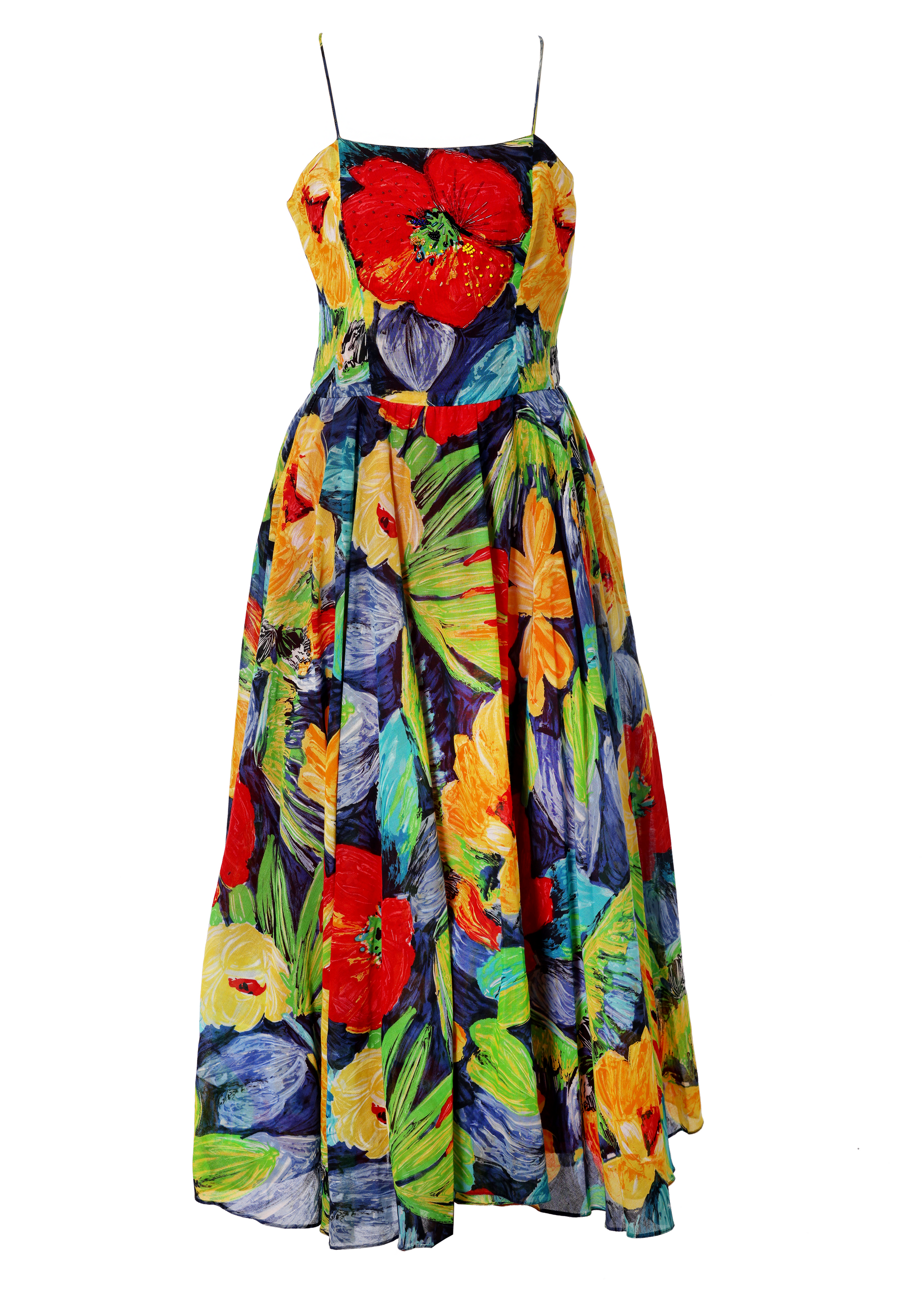 So full of whimsy with its large and vibrant painterly flowers, this dress by Australia's godfather of fashion, Peter Weiss features an almost full circle skirt, zip back closure, bone lining, delicate straps and a meticulously bead detailed bust.